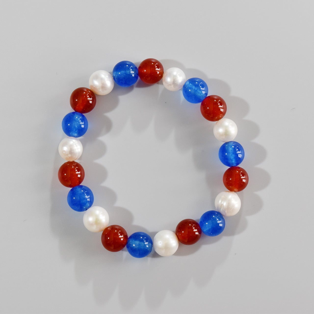カーネリアンの赤色とブルーアゲートの青色、真珠の白色によるトリコロールが鮮やかなブレスレットです。