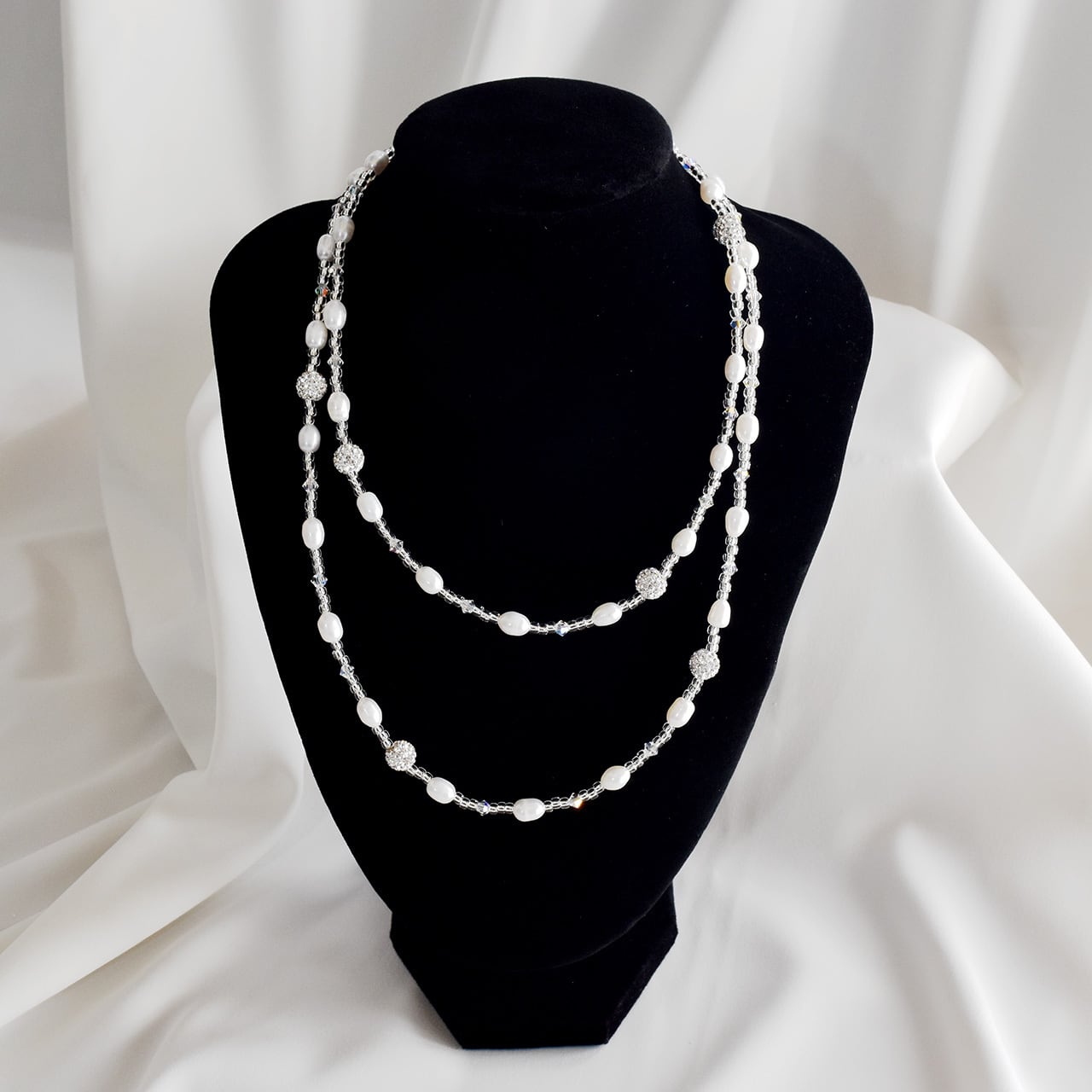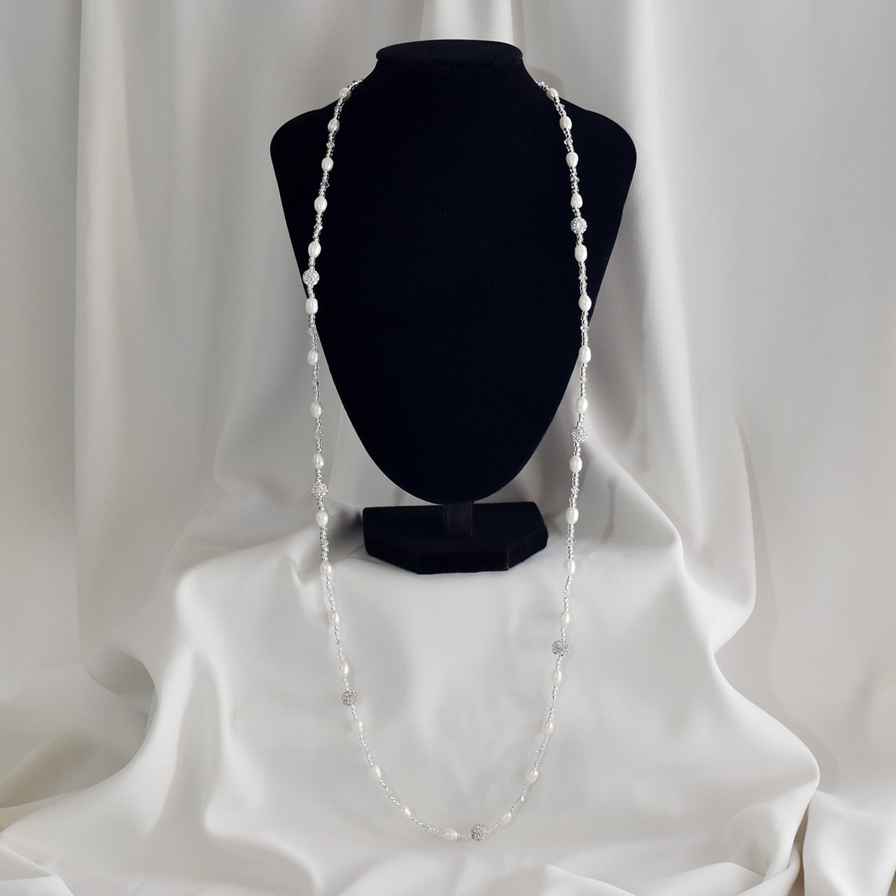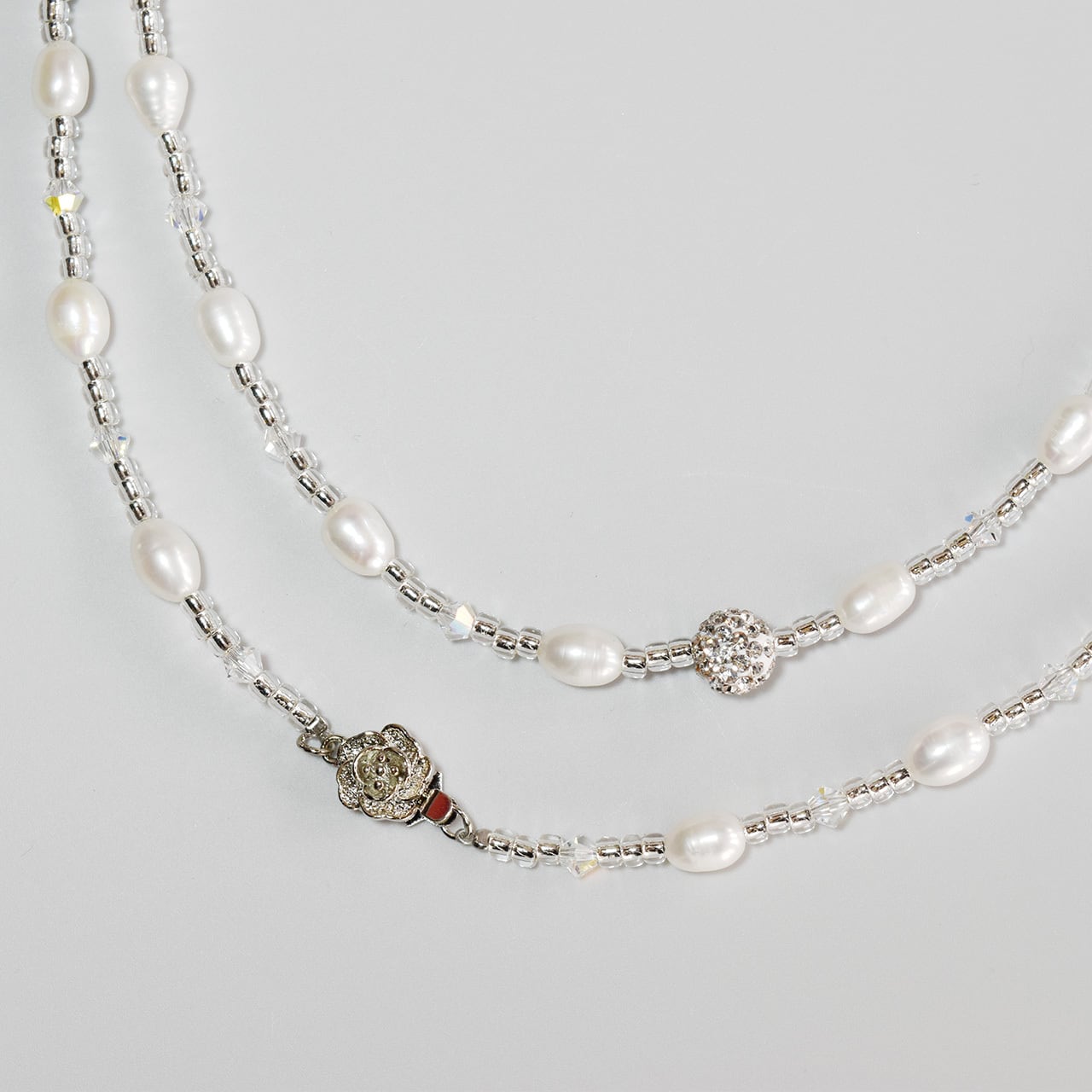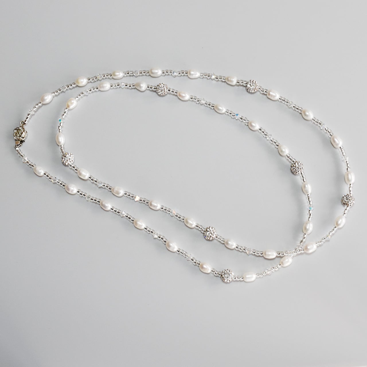 5-6mmの淡水真珠ライス珠がリズムを生む、90cmのロングタイプネックレスです。